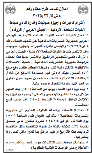 شراء كاميرات واجهزة صوتيات وانارة لنادي ضباط القوات المسلحة الاردنية - الجيش العربي / الزرقاء