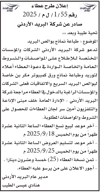 • إبحث في أكبر وأشمل قاعدة بيانات على مستوى الأردن, تحتوي على جميع العطاءات والمناقصات الحكومية، الدولية، الخاصة، والعسكرية مصنفة ومبوبة منذ عام 2013 حتى تاريخ اليوم!