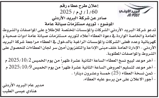 • إبحث في أكبر وأشمل قاعدة بيانات على مستوى الأردن, تحتوي على جميع العطاءات والمناقصات الحكومية، الدولية، الخاصة، والعسكرية مصنفة ومبوبة منذ عام 2013 حتى تاريخ اليوم!
