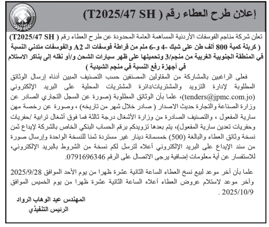 • إبحث في أكبر وأشمل قاعدة بيانات على مستوى الأردن, تحتوي على جميع العطاءات والمناقصات الحكومية، الدولية، الخاصة، والعسكرية مصنفة ومبوبة منذ عام 2013 حتى تاريخ اليوم!