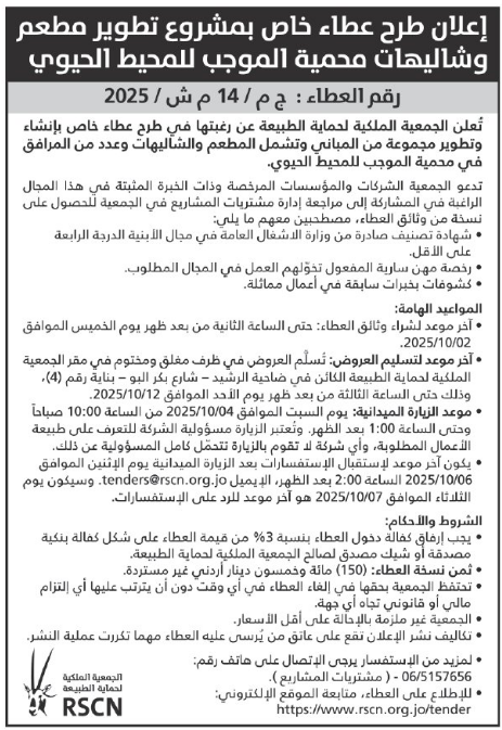 • إبحث في أكبر وأشمل قاعدة بيانات على مستوى الأردن, تحتوي على جميع العطاءات والمناقصات الحكومية، الدولية، الخاصة، والعسكرية مصنفة ومبوبة منذ عام 2013 حتى تاريخ اليوم!