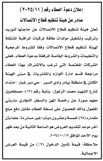 • إبحث في أكبر وأشمل قاعدة بيانات على مستوى الأردن, تحتوي على جميع العطاءات والمناقصات الحكومية، الدولية، الخاصة، والعسكرية مصنفة ومبوبة منذ عام 2013 حتى تاريخ اليوم!
