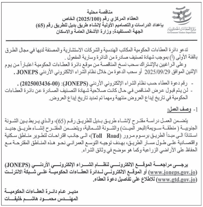 • إبحث في أكبر وأشمل قاعدة بيانات على مستوى الأردن, تحتوي على جميع العطاءات والمناقصات الحكومية، الدولية، الخاصة، والعسكرية مصنفة ومبوبة منذ عام 2013 حتى تاريخ اليوم!