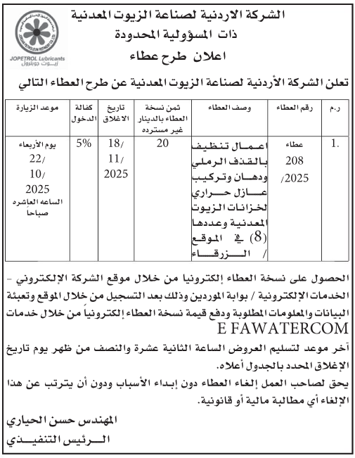 اعمال تنظيف بالقذف الرملي ودهان وتركيب وعازل حراري لخزانات الزيوت المعدنية وعددها (8)في موقع الزرقاء