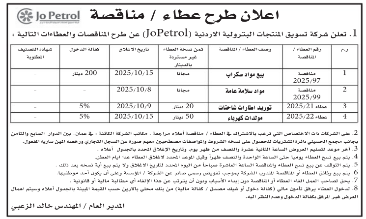 • إبحث في أكبر وأشمل قاعدة بيانات على مستوى الأردن, تحتوي على جميع العطاءات والمناقصات الحكومية، الدولية، الخاصة، والعسكرية مصنفة ومبوبة منذ عام 2013 حتى تاريخ اليوم!