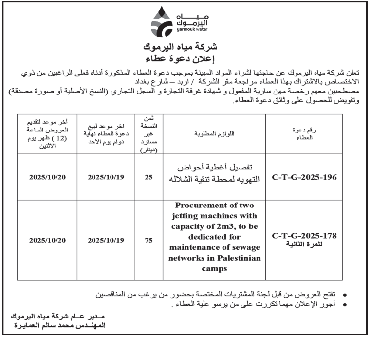 • إبحث في أكبر وأشمل قاعدة بيانات على مستوى الأردن, تحتوي على جميع العطاءات والمناقصات الحكومية، الدولية، الخاصة، والعسكرية مصنفة ومبوبة منذ عام 2013 حتى تاريخ اليوم!
