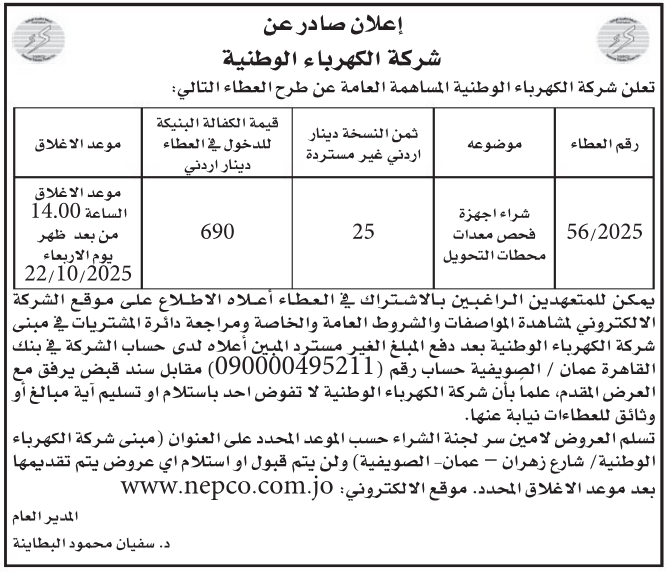 • إبحث في أكبر وأشمل قاعدة بيانات على مستوى الأردن, تحتوي على جميع العطاءات والمناقصات الحكومية، الدولية، الخاصة، والعسكرية مصنفة ومبوبة منذ عام 2013 حتى تاريخ اليوم!