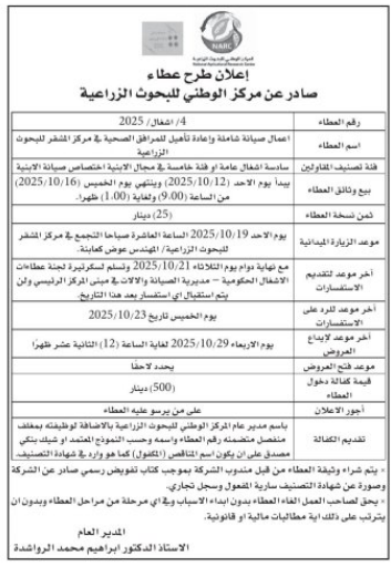 اعمال صيانة شاملة واعادة تاهيل للمرافق الصحية في مركز المشقر للبحوث الزراعية