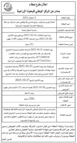 اعمال توريد وتركيب سياج معدني في موقعي عمل (مركز ديلا علا ومحطة الكرامة) للبحوث الزراعية