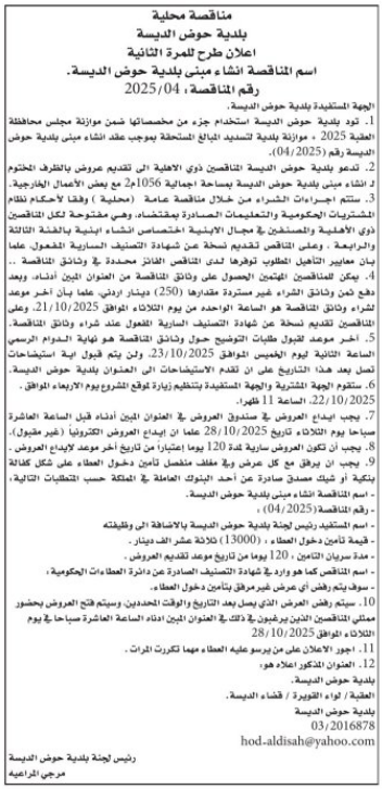 • إبحث في أكبر وأشمل قاعدة بيانات على مستوى الأردن, تحتوي على جميع العطاءات والمناقصات الحكومية، الدولية، الخاصة، والعسكرية مصنفة ومبوبة منذ عام 2013 حتى تاريخ اليوم!