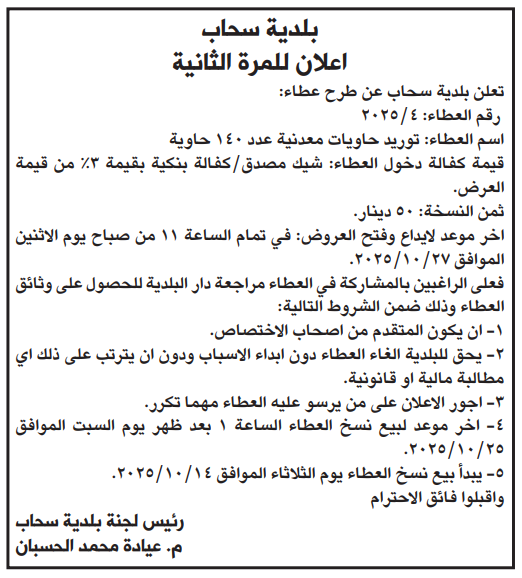 • إبحث في أكبر وأشمل قاعدة بيانات على مستوى الأردن, تحتوي على جميع العطاءات والمناقصات الحكومية، الدولية، الخاصة، والعسكرية مصنفة ومبوبة منذ عام 2013 حتى تاريخ اليوم!