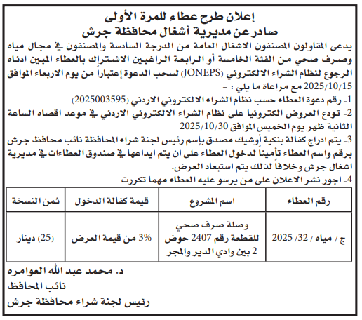 • إبحث في أكبر وأشمل قاعدة بيانات على مستوى الأردن, تحتوي على جميع العطاءات والمناقصات الحكومية، الدولية، الخاصة، والعسكرية مصنفة ومبوبة منذ عام 2013 حتى تاريخ اليوم!