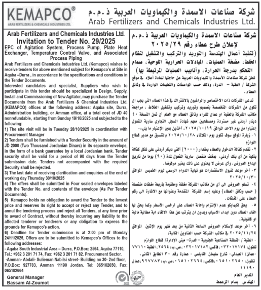 تنفيذ اعمال الهندسة والتوريد والتركيب والتشغيل لنظام الخلط مضخة العلميات المبادلات الحرارية اللوحية