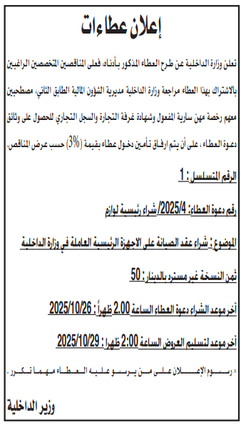 شراء عقد الصيانة على الاجهزة الرئيسية العامة في وزارة الداخلية
