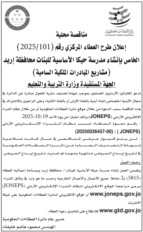 • إبحث في أكبر وأشمل قاعدة بيانات على مستوى الأردن, تحتوي على جميع العطاءات والمناقصات الحكومية، الدولية، الخاصة، والعسكرية مصنفة ومبوبة منذ عام 2013 حتى تاريخ اليوم!