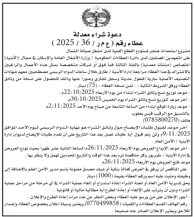• إبحث في أكبر وأشمل قاعدة بيانات على مستوى الأردن, تحتوي على جميع العطاءات والمناقصات الحكومية، الدولية، الخاصة، والعسكرية مصنفة ومبوبة منذ عام 2013 حتى تاريخ اليوم!