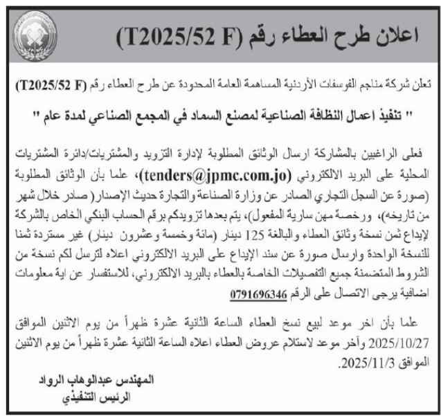 تنفيذ اعمال النظافة الصناعية لمصنع السماد في المجمع الصناعي لمدة عام