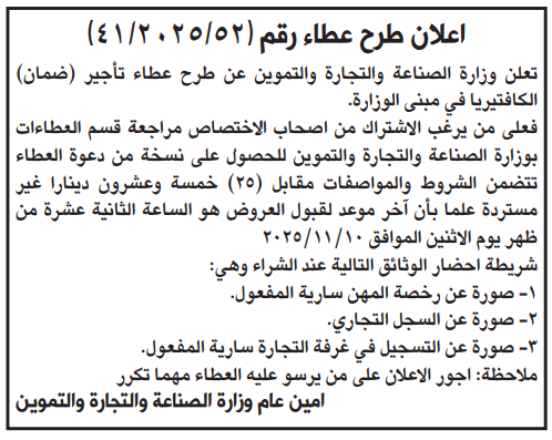 تاجير (ضمان) الكفتيريا في مبنى الوزارة