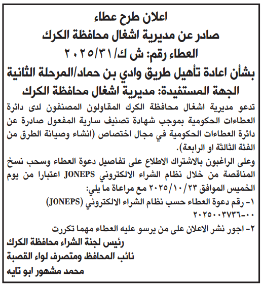 • إبحث في أكبر وأشمل قاعدة بيانات على مستوى الأردن, تحتوي على جميع العطاءات والمناقصات الحكومية، الدولية، الخاصة، والعسكرية مصنفة ومبوبة منذ عام 2013 حتى تاريخ اليوم!