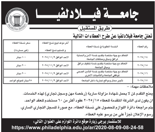 • إبحث في أكبر وأشمل قاعدة بيانات على مستوى الأردن, تحتوي على جميع العطاءات والمناقصات الحكومية، الدولية، الخاصة، والعسكرية مصنفة ومبوبة منذ عام 2013 حتى تاريخ اليوم!