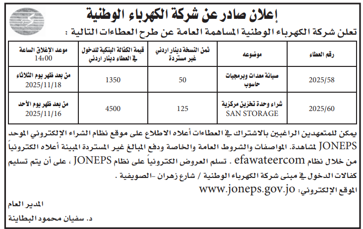 • إبحث في أكبر وأشمل قاعدة بيانات على مستوى الأردن, تحتوي على جميع العطاءات والمناقصات الحكومية، الدولية، الخاصة، والعسكرية مصنفة ومبوبة منذ عام 2013 حتى تاريخ اليوم!