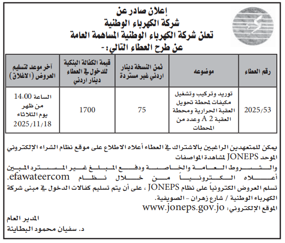 • إبحث في أكبر وأشمل قاعدة بيانات على مستوى الأردن, تحتوي على جميع العطاءات والمناقصات الحكومية، الدولية، الخاصة، والعسكرية مصنفة ومبوبة منذ عام 2013 حتى تاريخ اليوم!