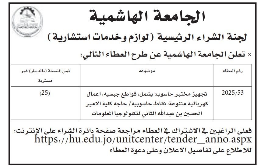 تجهيز مختبر حاسوب، يشمل، قواطع جبسيه، اعمال كهربائية متنوعة، نقاط حاسوبية - حاجة كلية الامير الحسين بن عبدالله الثاني لتكنولوجيا المعلومات