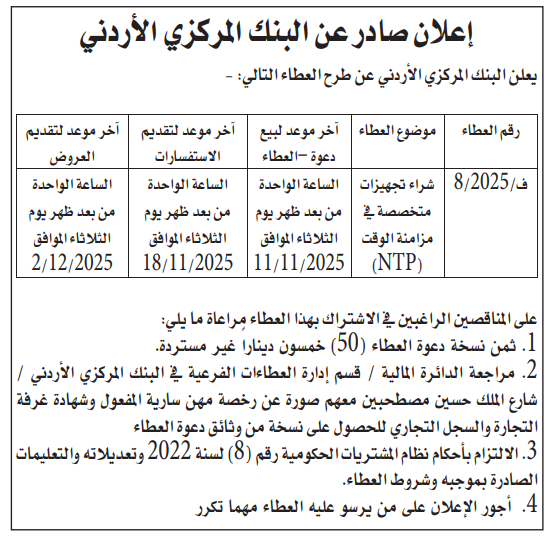 • إبحث في أكبر وأشمل قاعدة بيانات على مستوى الأردن, تحتوي على جميع العطاءات والمناقصات الحكومية، الدولية، الخاصة، والعسكرية مصنفة ومبوبة منذ عام 2013 حتى تاريخ اليوم!