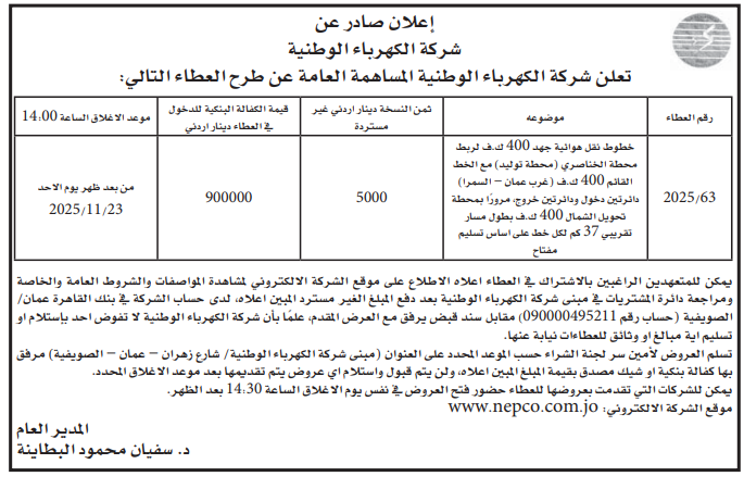 • إبحث في أكبر وأشمل قاعدة بيانات على مستوى الأردن, تحتوي على جميع العطاءات والمناقصات الحكومية، الدولية، الخاصة، والعسكرية مصنفة ومبوبة منذ عام 2013 حتى تاريخ اليوم!