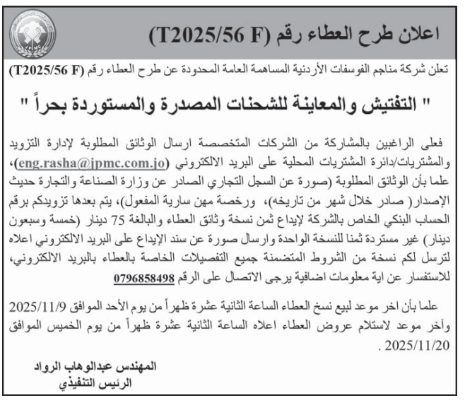 • إبحث في أكبر وأشمل قاعدة بيانات على مستوى الأردن, تحتوي على جميع العطاءات والمناقصات الحكومية، الدولية، الخاصة، والعسكرية مصنفة ومبوبة منذ عام 2013 حتى تاريخ اليوم!