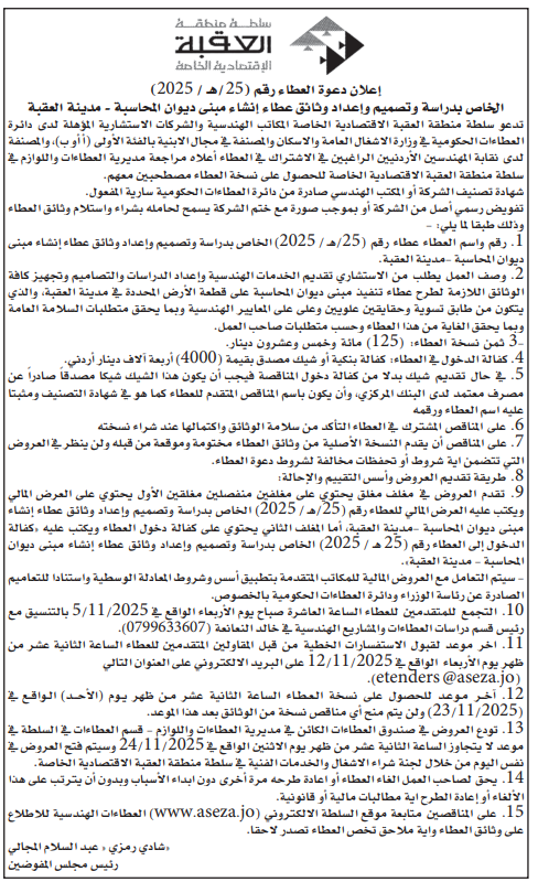 دراسة وتصميم واعداد وثائق عطاء انشاء  مبنى ديوان المحاسبة