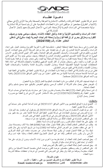 اعداد الدراسات والتصاميم الاولية واعداد وثائق العطاء لانشاء رصيف سياحي جديد ورصيف للقوارب ومنزلق بحري