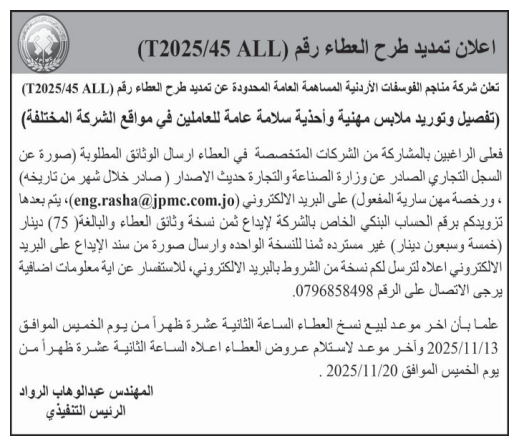 • إبحث في أكبر وأشمل قاعدة بيانات على مستوى الأردن, تحتوي على جميع العطاءات والمناقصات الحكومية، الدولية، الخاصة، والعسكرية مصنفة ومبوبة منذ عام 2013 حتى تاريخ اليوم!
