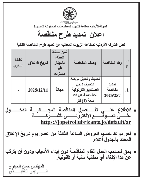 • إبحث في أكبر وأشمل قاعدة بيانات على مستوى الأردن, تحتوي على جميع العطاءات والمناقصات الحكومية، الدولية، الخاصة، والعسكرية مصنفة ومبوبة منذ عام 2013 حتى تاريخ اليوم!