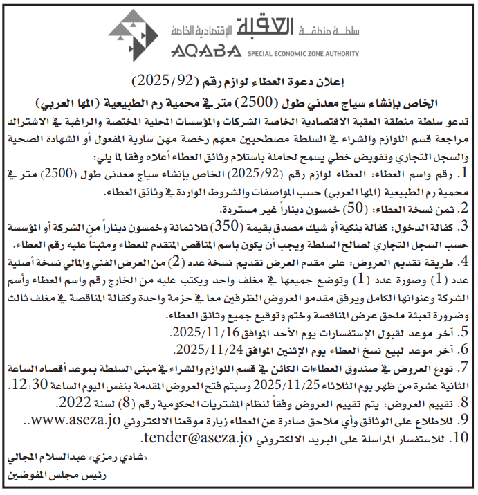 انشاء سياج معدني طول (2500) متر في محمية رم الطبيعية
