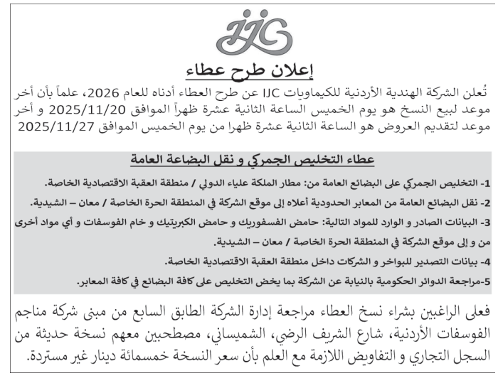 • إبحث في أكبر وأشمل قاعدة بيانات على مستوى الأردن, تحتوي على جميع العطاءات والمناقصات الحكومية، الدولية، الخاصة، والعسكرية مصنفة ومبوبة منذ عام 2013 حتى تاريخ اليوم!