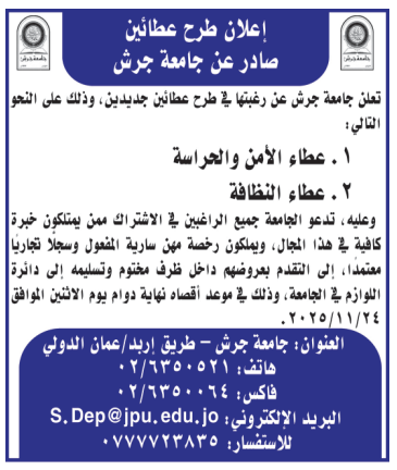 • إبحث في أكبر وأشمل قاعدة بيانات على مستوى الأردن, تحتوي على جميع العطاءات والمناقصات الحكومية، الدولية، الخاصة، والعسكرية مصنفة ومبوبة منذ عام 2013 حتى تاريخ اليوم!