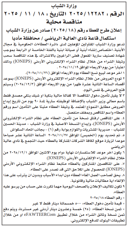 • إبحث في أكبر وأشمل قاعدة بيانات على مستوى الأردن, تحتوي على جميع العطاءات والمناقصات الحكومية، الدولية، الخاصة، والعسكرية مصنفة ومبوبة منذ عام 2013 حتى تاريخ اليوم!