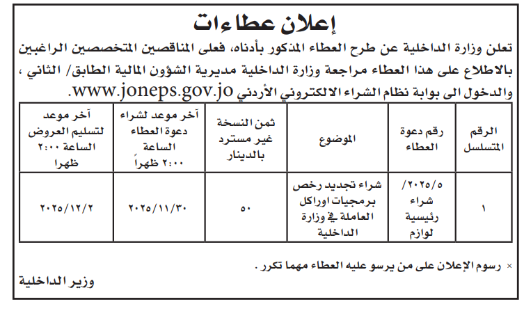 • إبحث في أكبر وأشمل قاعدة بيانات على مستوى الأردن, تحتوي على جميع العطاءات والمناقصات الحكومية، الدولية، الخاصة، والعسكرية مصنفة ومبوبة منذ عام 2013 حتى تاريخ اليوم!
