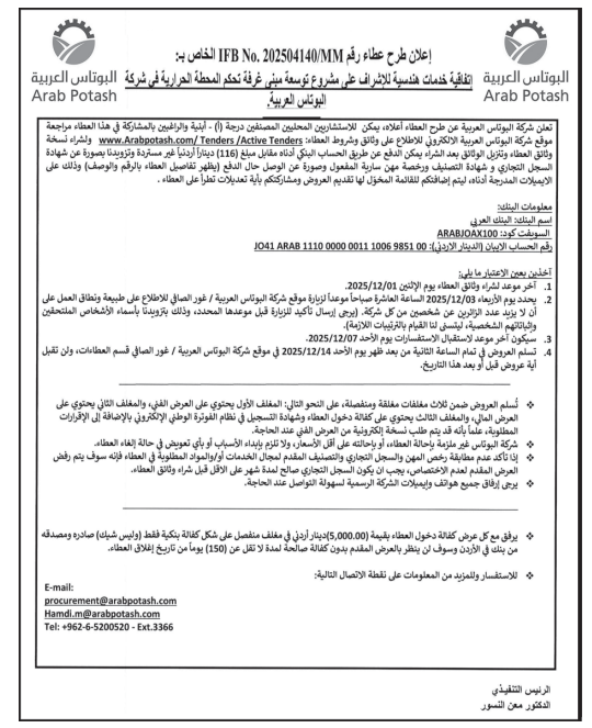 • إبحث في أكبر وأشمل قاعدة بيانات على مستوى الأردن, تحتوي على جميع العطاءات والمناقصات الحكومية، الدولية، الخاصة، والعسكرية مصنفة ومبوبة منذ عام 2013 حتى تاريخ اليوم!