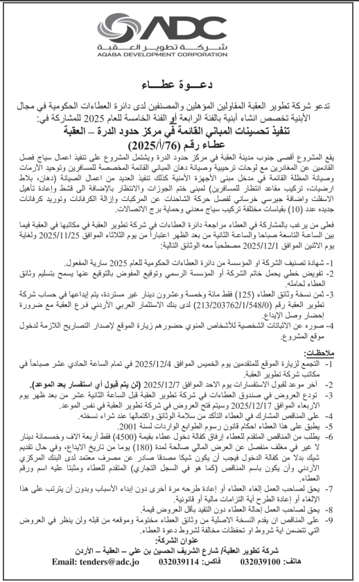 • إبحث في أكبر وأشمل قاعدة بيانات على مستوى الأردن, تحتوي على جميع العطاءات والمناقصات الحكومية، الدولية، الخاصة، والعسكرية مصنفة ومبوبة منذ عام 2013 حتى تاريخ اليوم!