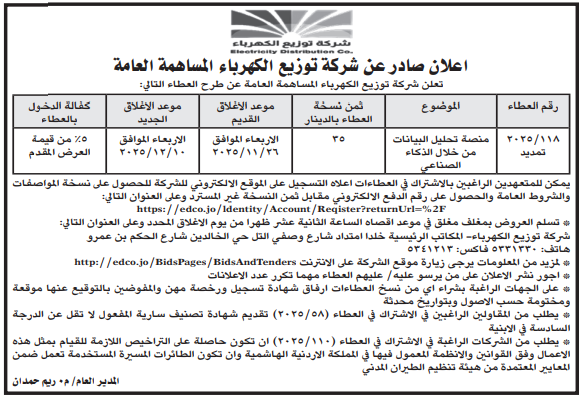 • إبحث في أكبر وأشمل قاعدة بيانات على مستوى الأردن, تحتوي على جميع العطاءات والمناقصات الحكومية، الدولية، الخاصة، والعسكرية مصنفة ومبوبة منذ عام 2013 حتى تاريخ اليوم!