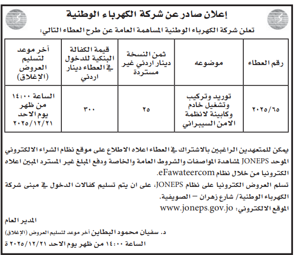 • إبحث في أكبر وأشمل قاعدة بيانات على مستوى الأردن, تحتوي على جميع العطاءات والمناقصات الحكومية، الدولية، الخاصة، والعسكرية مصنفة ومبوبة منذ عام 2013 حتى تاريخ اليوم!