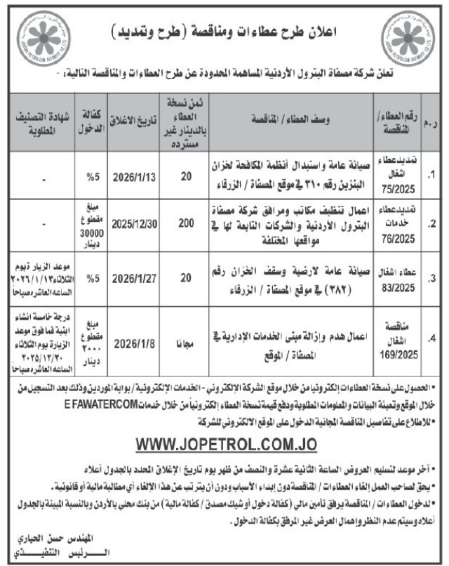 • إبحث في أكبر وأشمل قاعدة بيانات على مستوى الأردن, تحتوي على جميع العطاءات والمناقصات الحكومية، الدولية، الخاصة، والعسكرية مصنفة ومبوبة منذ عام 2013 حتى تاريخ اليوم!