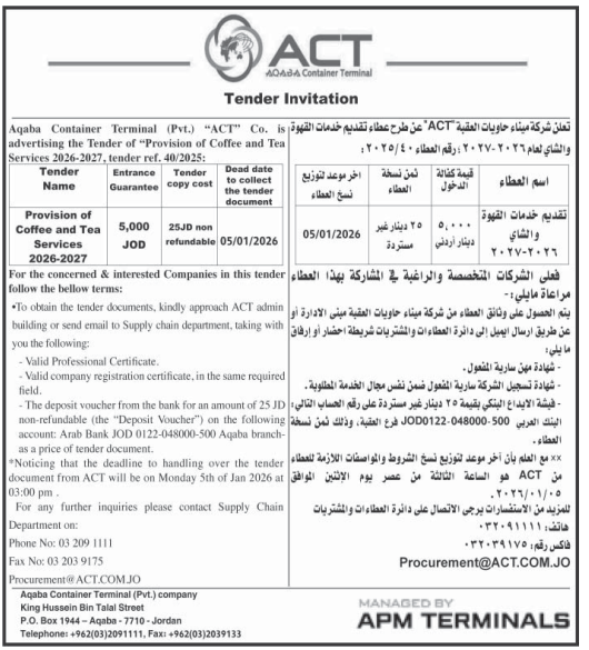 • إبحث في أكبر وأشمل قاعدة بيانات على مستوى الأردن, تحتوي على جميع العطاءات والمناقصات الحكومية، الدولية، الخاصة، والعسكرية مصنفة ومبوبة منذ عام 2013 حتى تاريخ اليوم!
