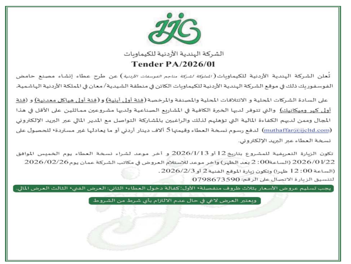 • إبحث في أكبر وأشمل قاعدة بيانات على مستوى الأردن, تحتوي على جميع العطاءات والمناقصات الحكومية، الدولية، الخاصة، والعسكرية مصنفة ومبوبة منذ عام 2013 حتى تاريخ اليوم!