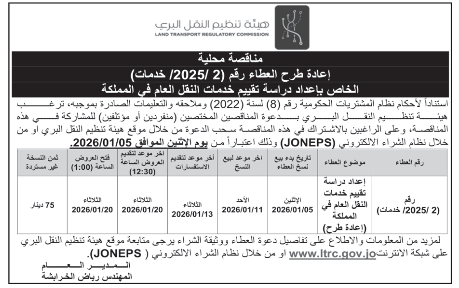 • إبحث في أكبر وأشمل قاعدة بيانات على مستوى الأردن, تحتوي على جميع العطاءات والمناقصات الحكومية، الدولية، الخاصة، والعسكرية مصنفة ومبوبة منذ عام 2013 حتى تاريخ اليوم!