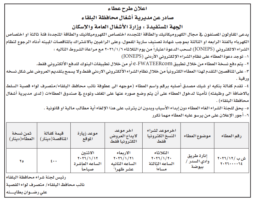 • إبحث في أكبر وأشمل قاعدة بيانات على مستوى الأردن, تحتوي على جميع العطاءات والمناقصات الحكومية، الدولية، الخاصة، والعسكرية مصنفة ومبوبة منذ عام 2013 حتى تاريخ اليوم!