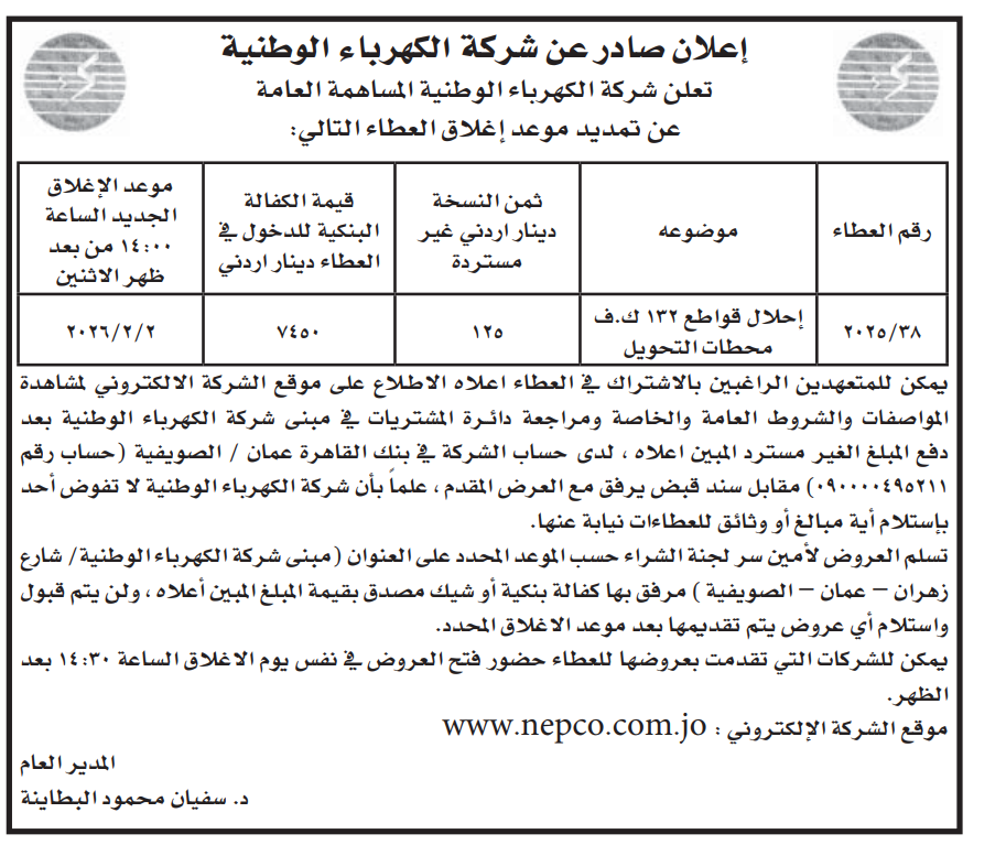 • إبحث في أكبر وأشمل قاعدة بيانات على مستوى الأردن, تحتوي على جميع العطاءات والمناقصات الحكومية، الدولية، الخاصة، والعسكرية مصنفة ومبوبة منذ عام 2013 حتى تاريخ اليوم!