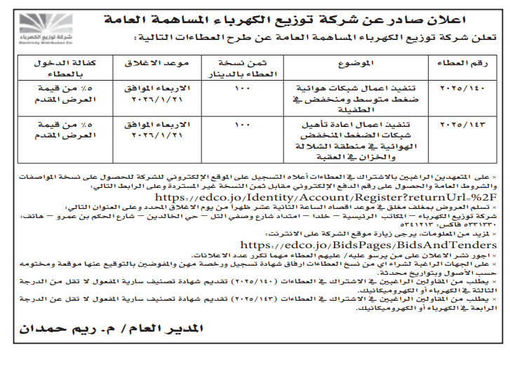 • إبحث في أكبر وأشمل قاعدة بيانات على مستوى الأردن, تحتوي على جميع العطاءات والمناقصات الحكومية، الدولية، الخاصة، والعسكرية مصنفة ومبوبة منذ عام 2013 حتى تاريخ اليوم!